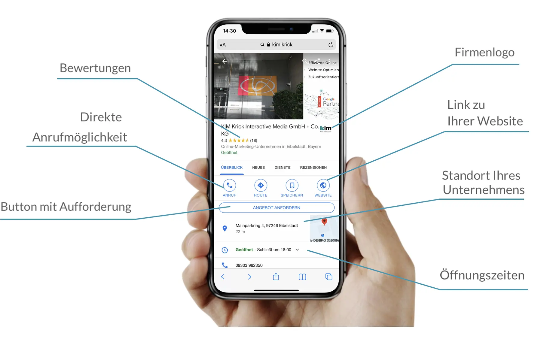 Durch Ihr prominent platziertes Google Unternehmensprofil haben Ihre Kunden die Möglichkeit zur direkten und unkomplizierten Kontaktaufnahme.